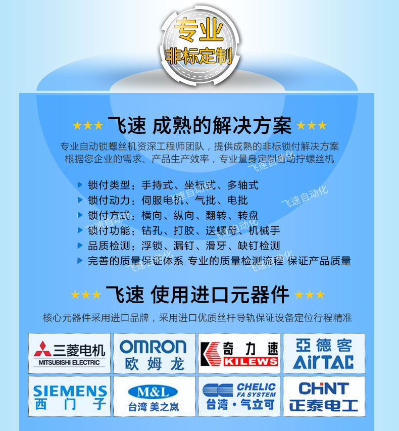 led燈帶是指把LED組裝在帶狀的柔性線路板或PCB硬板上,產品形狀象一條帶子又非常節能和綠色環保,用于各個行業中的裝飾,LED燈帶的使用也越來越普及,也因為使用壽命長(一般正常壽命在8~10萬小時),所以在市場上需求也比較大。 LED燈帶是采用FPC做組裝線路板,生產組裝過程中都需要對燈具貼片和各個工件進行螺絲緊鎖加工,在傳統的生產線上,技術工人需要對不同型號的燈具體分別進行螺絲鎖緊加工操作,雖然也應用了自動機器人之類的自動設備,但是傳統生產線的自動化水平還比較低,不能適用于不同型號的燈具加工,設備的自動化水平還需提高。 本案例應用于LED燈帶自動化生產線的自動鎖螺絲機,主要目的在于解決生產中的不足和缺點,設計一臺自動化燈具生產螺絲設備,它不僅可以對燈具進行自動化地組裝、鎖緊加工操作,而且可以適用于不同型號、規格、大小的燈具體,設備的自動化水平比較高。 該設備根據產品進行設計多工位轉盤式螺絲機,通過在轉盤式安放多個工位實現多工序同步作業,主要是為了實現擰螺絲和取放產品同步完成,作業員不停放置產品,設備不停擰螺絲,增強了人機協作,較大幅度提升效率,減輕人工勞動強度。