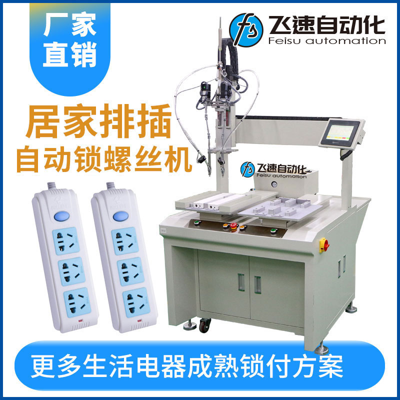 那么排插在生產(chǎn)線進(jìn)行大批量產(chǎn)品生產(chǎn)、加工、裝配時,涉及到螺絲安裝的時候,需要人工手工完成,人工不僅需要對工件進(jìn)行夾緊定位,還需要人工操作提供螺絲、對螺絲進(jìn)行定位和操作手動擰螺絲工具,對操作人員的技術(shù)方面難度加大了一點(diǎn),同時還會降低加工效率,并且也帶來了大量人工成本的提高等,針對這一問題,飛速自動化根據(jù)產(chǎn)品設(shè)計(jì)一臺自動加擰緊工螺絲設(shè)備可以在流水作業(yè)時,自動輸送、自動供料、自動夾緊工件、自動分螺絲方向、自動定位、自動找正螺孔、自動扭緊的自動加工螺絲設(shè)備,以解決人工完成上述操作帶來的產(chǎn)品一致性差、操作效率低以及人工成本高的問題。 排插的外殼體需8顆螺絲鎖付,螺絲類型為內(nèi)十字圓頭螺絲,為提高效率。