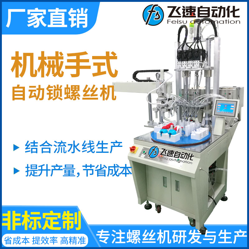 轉盤機械手式擰螺絲機優點: 省人工,流水線專用,配置機械手和轉盤,實現供料、檢測、鎖付、取放產品同步作業,并由設備自動完成,節省大量人工;