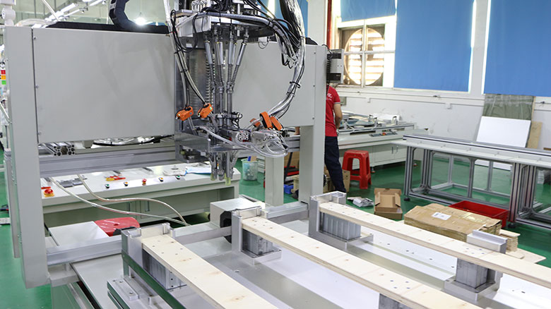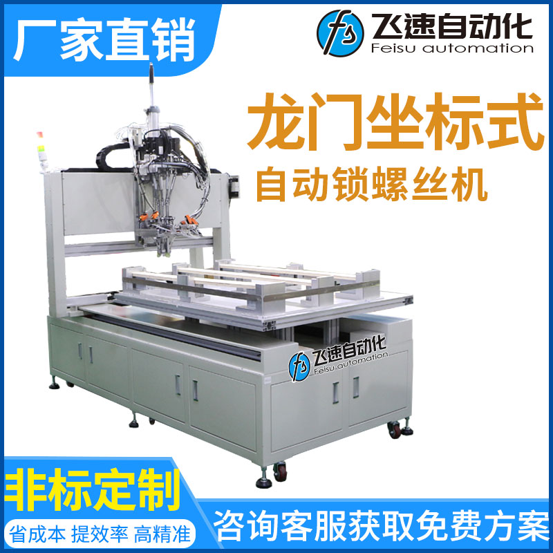 本案例是鎖卡板上的螺絲,由于產(chǎn)品比較大,所以采用伺服龍門坐標式自動鎖螺絲機,產(chǎn)品用獨立升降氣缸鎖付,機器共有6個軸,一次可以鎖6顆螺絲。