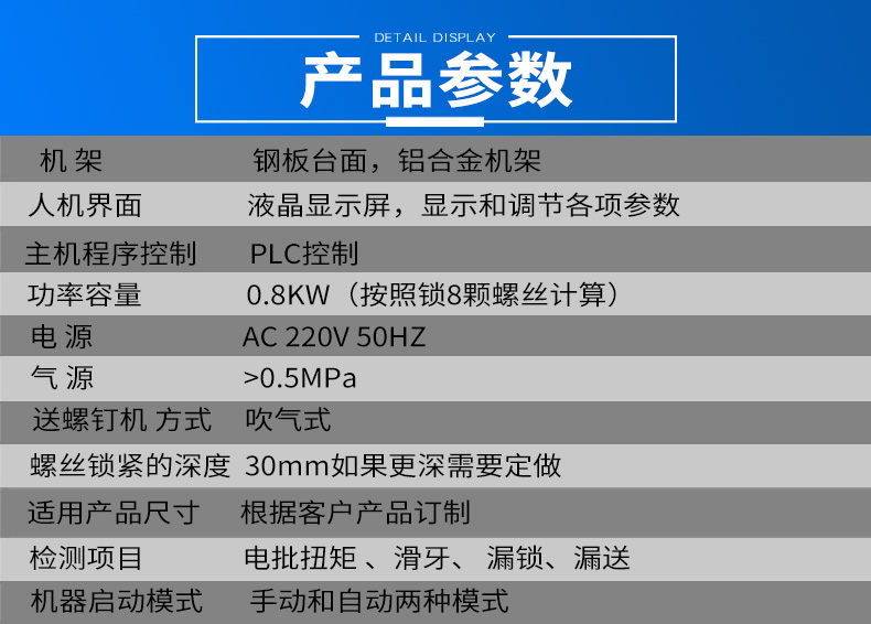 • 產(chǎn)品簡介: 該款設(shè)備是用來鎖付坐墊的,坐墊上有九顆螺絲,通過該款螺絲機(jī),我們將扭力調(diào)整至一定程度,讓夾咀中的螺絲擰緊到合適位置,從而使該款坐墊達(dá)到牢固的效果。